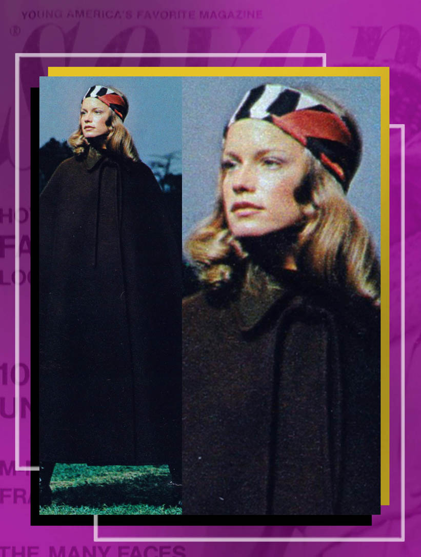 Shelley appeared on many spreads throughout Seventeen magazine's December 1970 issue. In the spread called "The New Heroine: Cloaked in Charisma", she modeled a romantic medieval-inspired cape that was perfect for the cold months ahead. She wore the "Collarful Cape", a collared Gothic brown ankle-length cape which was kept in place with a string - by Larry Levine. A pair of matching boots and a Geretek scarf around her head finished her look. Shelley looked like a romantic heroine in her Gothic-inspired ensemble.