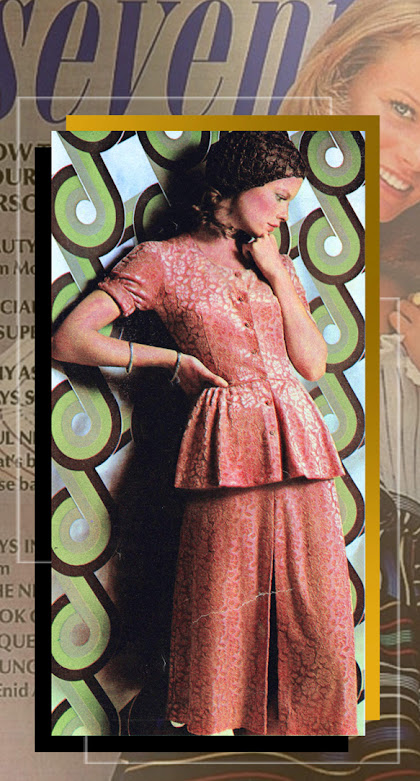 Shelley appeared on the cover as well as in many spreads throughout Seventeen magazine's November 1970 issue. In the spread called "Slink into Some Glossed-up Velvet Starstuff... It's Your Big Scene", she modeled dresses, both long and short, in clingy panne velvet (reminiscent of the leading ladies of Hollywood's Golden era) that could be worn during those special evenings. She wore a two-piece evening dress in gleamy salmon pink. The top had a scoop neck, short sleeves and a gathered peplum. The matching midiskirt had a slit that went all the way up. Both pieces were by Snapdragon. An open crochet skull cap by Christa and coordinating bracelets finished her look. And Shelley looked just fabulous.